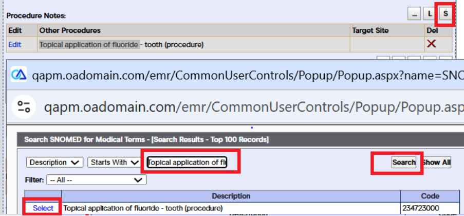 Step 1: Select the procedure note SNOMED code